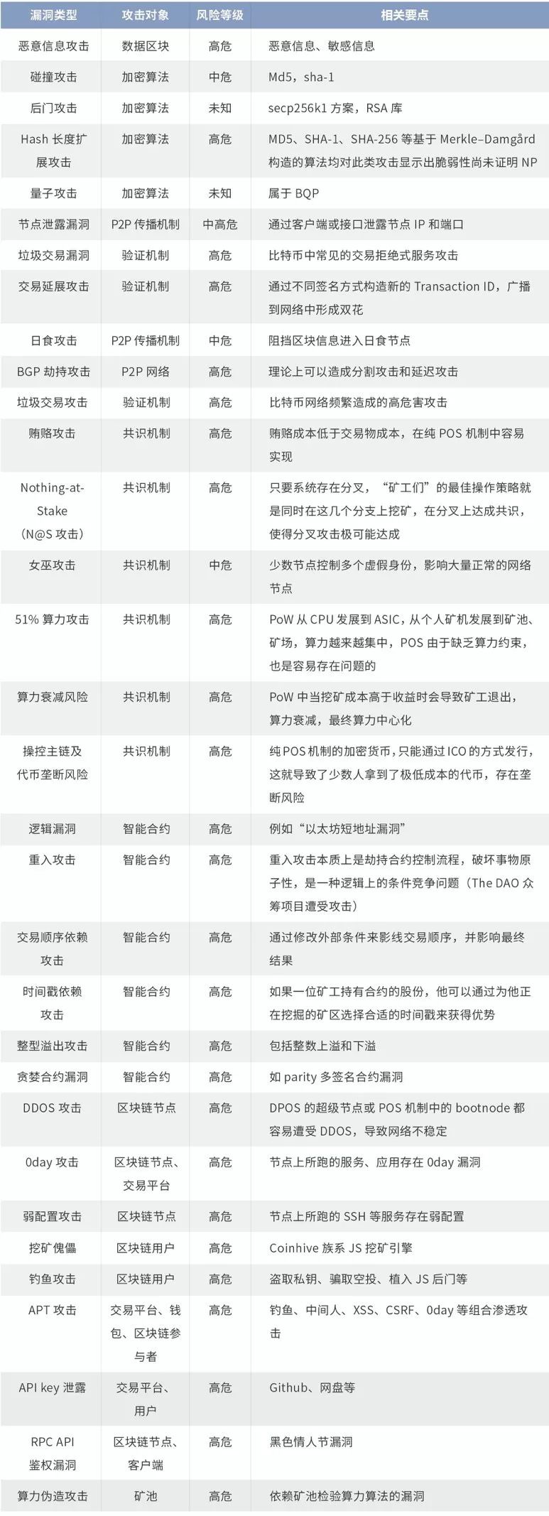 区块链漏洞分类 通过对区块链分层框架的分析,结合我们对区块链项目所发生历史安全事件的统计,我们认为攻击行为对象主要是以下几个方面: 加密算法及数据区块 基础网络 共识机制 智能合约 承载平台及应用 区块链节点 区块链参与者 1.攻击路径线索 其中基于时间戳的链式数据区块结构、P2P 节点的共识机制、可编程的智能合约是区块链最具代表性的创新点,其攻防技术在安全领域也属于比较新的研究范畴;其他几方面的攻防技术则可以归为传统的安全研究范畴,可以拿出较成熟的解决方案。另外我们通过攻击事件还原发现,从攻击者的角度主要有以下两条攻击路径起点: 区块链项目中的中心化对象:交易平台、在线钱包、公有链的启动节点和全节点; 区块链项目的去中心化对象:共识机制、智能合约、Dapp。 前者将攻击聚焦于“点”,侧重于APT 的攻击艺术;后者将攻击聚焦于“面”,侧重的是漏洞的挖掘,这在防御的方式上是有很大区别的。 2. 攻击方式分类 下面列举了区块链各环节一些常见的攻击方式: