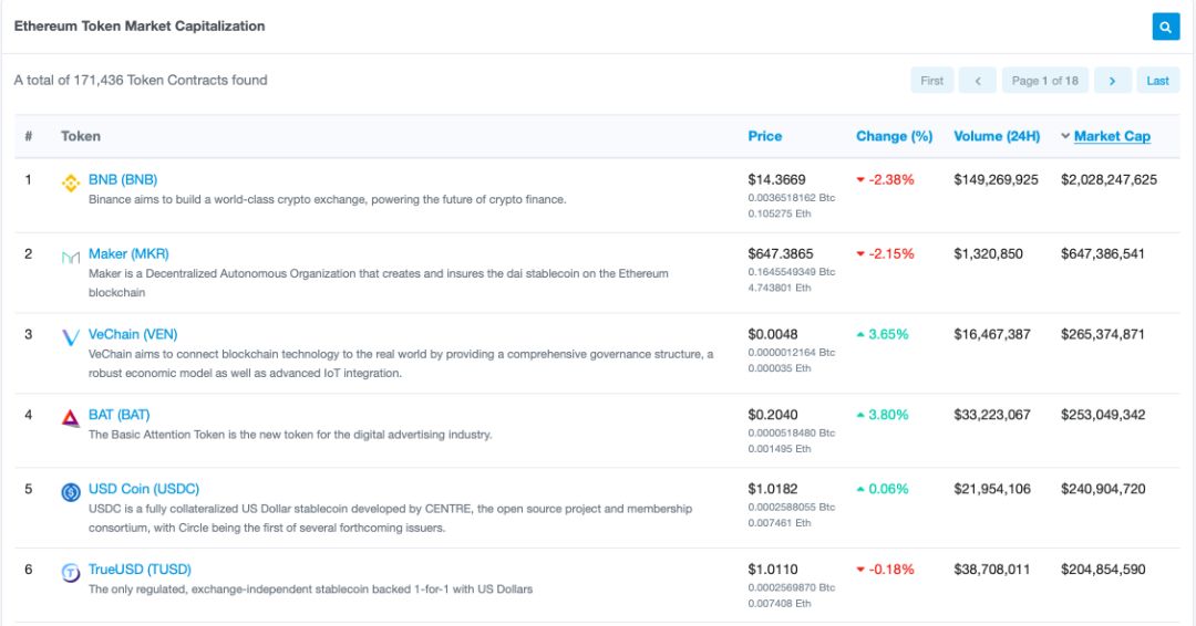 根据Etherscan的统计,基于以太坊发行的ERC-20 Token种类已经超过了17万,目前市值最高的是交易平台币安发行的平台币——BNB。