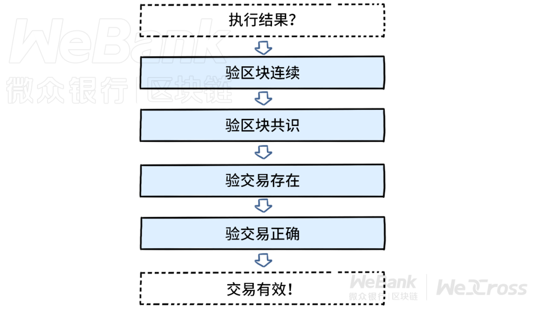 因此,在WeCross目前的实现中,仅需判断交易是否在交易列表中(且对应flag有效),并校验交易列表哈希值,即可初步判断交易的存在性。