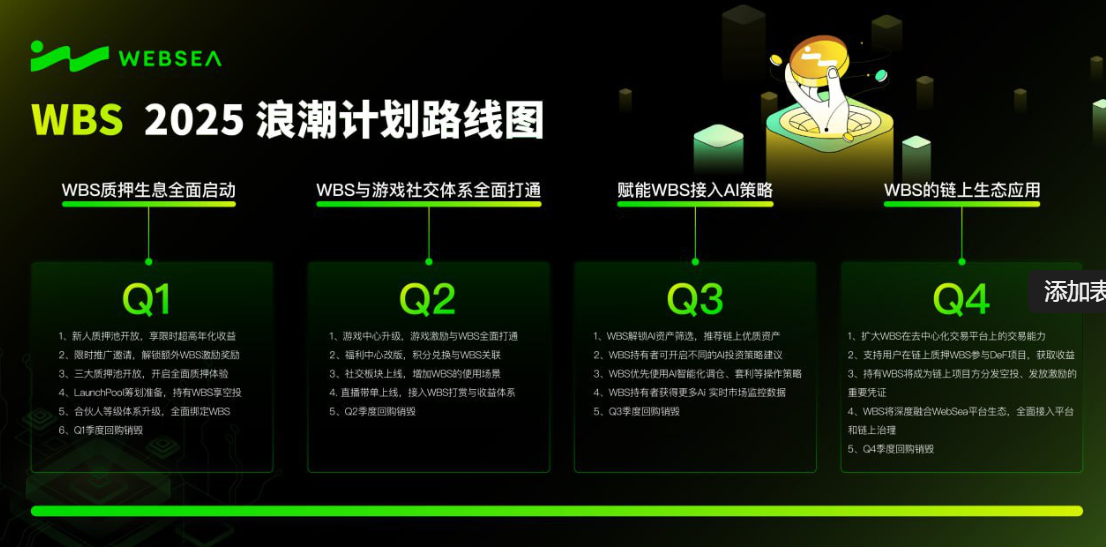对于全球首个游戏社交加密平台 Websea 来说,2025 年也将会是里程碑式的一年。Websea 团队凭借其长期的行业积淀与技术创新,迎来了一个崭新的里程碑——「浪潮计划」。这个以 W BS 为核心的全新计划,旨在创造一个将 WBS 融合社交、游戏、去中心化金融(DeFi)等多个领域的生态系统,WBS 作为 Websea 的平台代币将发挥至关重要的作用,并使 Websea 成为全球领先的加密平台之一。