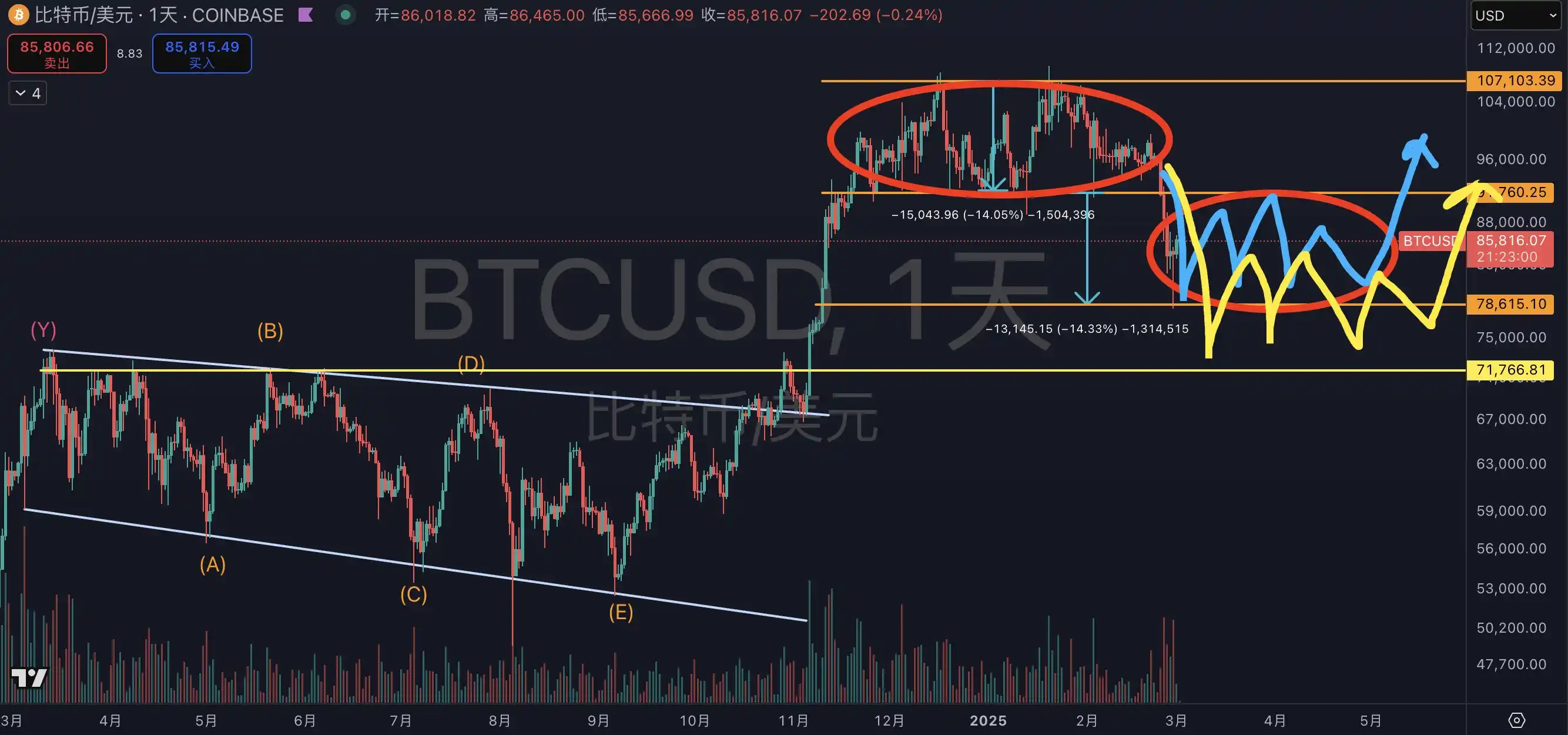 从技术角度看,比特币价格正处于关键节点。自 2024 年 11 月 20 日至 2025 年 2 月 24 日的高位震荡结束后,价格形成潜在的双顶形态——一种典型的看跌信号。双顶颈线跌破后,价格从最高点$82,000 回落至$76,000 附近,波幅已接近预期目标(约 10%),但时间维度上尚未充分消化。
