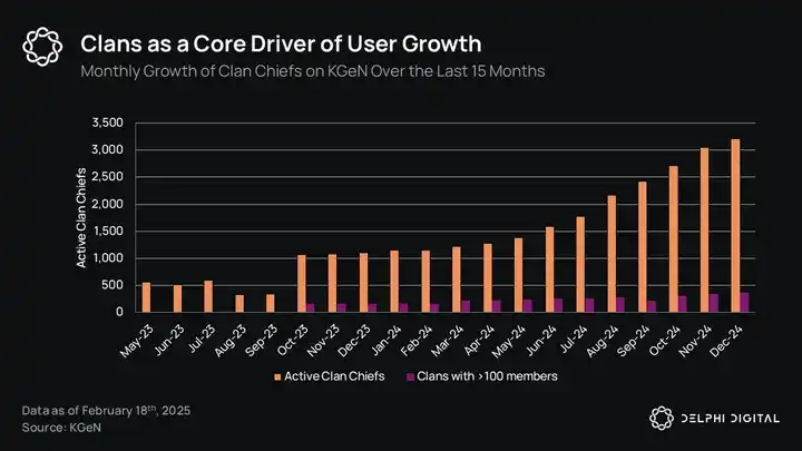 KGeN 增长的核心在于其草根部落和部落首领网络,这也是其能够在全球南方持续扩展的关键。部落代表了加入 KGeN 生态系统的数千个微型社区,例如同事、电竞组织、网红和以游戏为核心的社交群体。截至 2024 年 12 月,KGeN 自报共有 2,525 个部落,其中 152 个部落拥有超过 100 名成员。