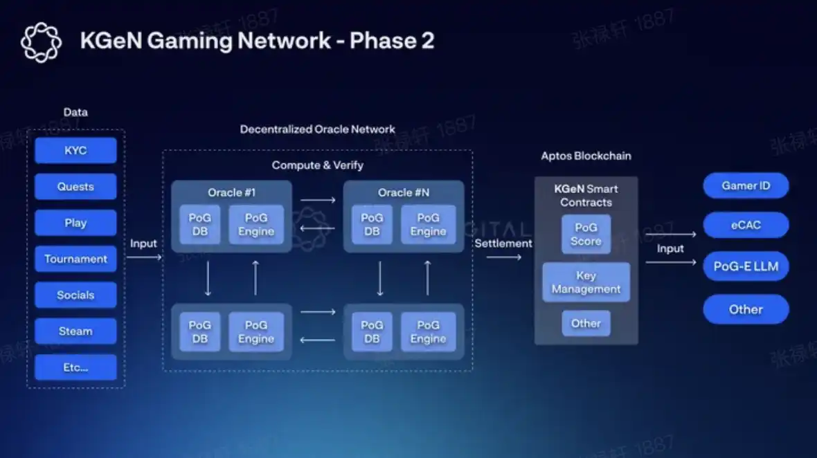 KGeN 预言机网络是一个由许可节点组成的分布式网络,将共同构成 PoG 引擎的骨干。每个预言机的任务是存储 PoG 数据、计算 PoG 评分(并共同验证其准确性),并将这些评分提交到 Aptos 区块链进行结算。作为提供此服务的回报,预言机运营商将根据收入预测获得固定的 KGEN 代币收益,以及与投资于预言机的金额相关的稳定币收益。