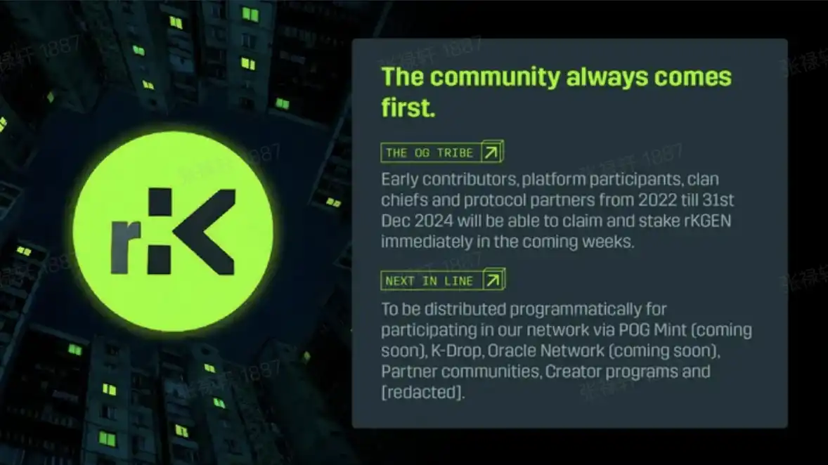 最近宣布,在 TGE 之前,KGeN 将利用 K-Points -> rKGEN 空投活动。rKGEN 分配基于用户的 K-Points 总量、在 KGeN 上的时间和关联性。一旦代币上线,rKGEN 可以以 1:1 的比例转换为 KGEN 代币。然而,部分用户将能够在 TGE 之前开始质押 rKGEN 以获得额外的代币收益。