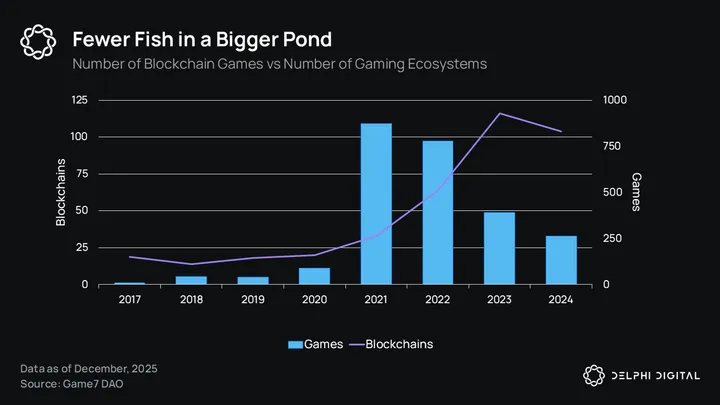 对于这样一个相对规模较小的市场(全球游戏玩家总数超过 30 亿),其面临的挑战在过去两年间被新兴 Web3 游戏生态系统的激增进一步加剧。Game7 的数据表明,尽管自 2021 年以来,新 Web3 游戏的数量平均下降了 45%,但同期新网络的数量却平均增长了 187%。仅在 2024 年,就有 104 个新的网络/生态系统宣布上线,而同期新发布的 Web3 游戏仅为 263 款。