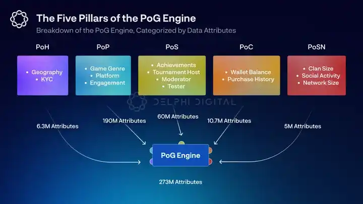 PoG 引擎是一个由分布式节点网络托管的去中心化玩家评分系统。PoG 由五个核心支柱组成,每个支柱包含五到十个属性。这些数据点追踪玩家的技能、「人性化」、参与度、财富和社交网络,以构建一个多方面的跨链声誉系统。