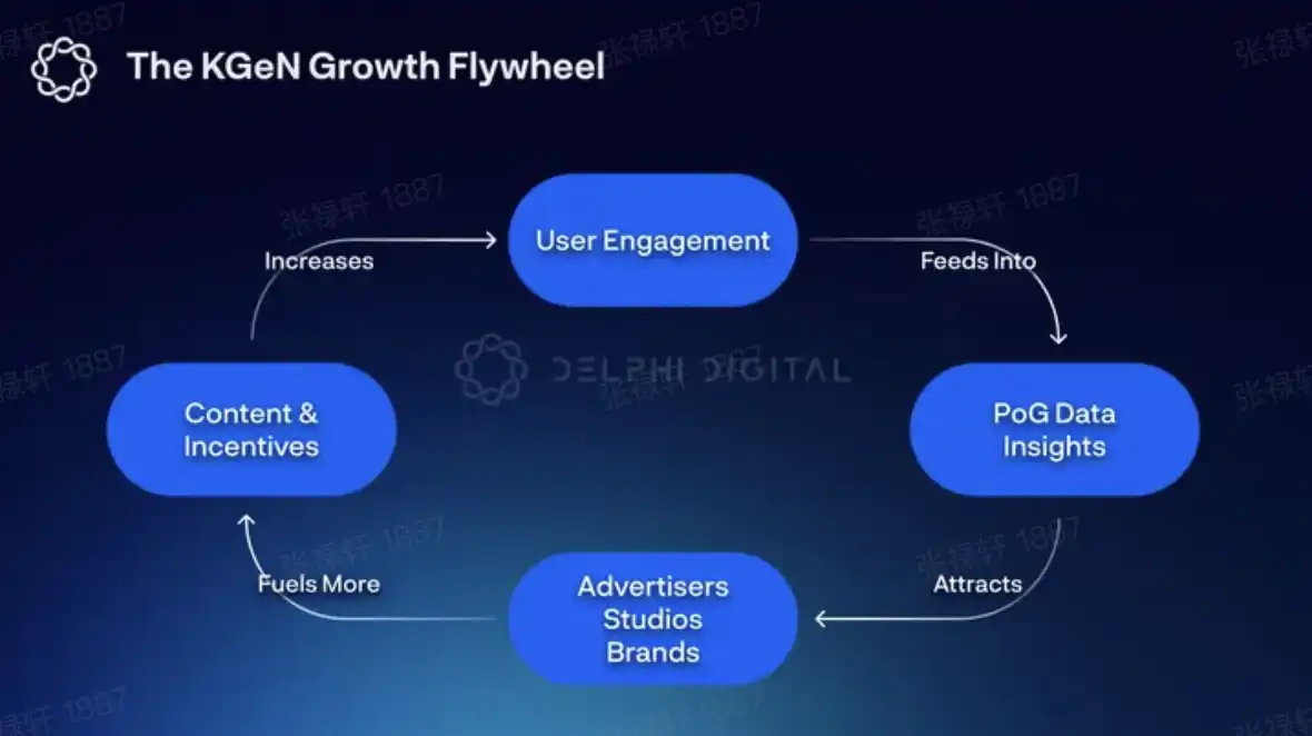 随着时间的推移,对 KGeN 未来扩展至关重要的增长飞轮将获得动力。只要对正面的 PoG 评分有需求,KGeN Play 的参与度就会增加(这可以通过基于 PoG 评分的金融激励进一步加速)。这一活动将推动 PoG 引擎,增加属性总数并丰富 KGeN 的用户数据库。随后,更多的发行商将被吸引到生态系统中,增加 KGeN Play 和 KGeN Store 的产品种类,从而吸引更多用户。