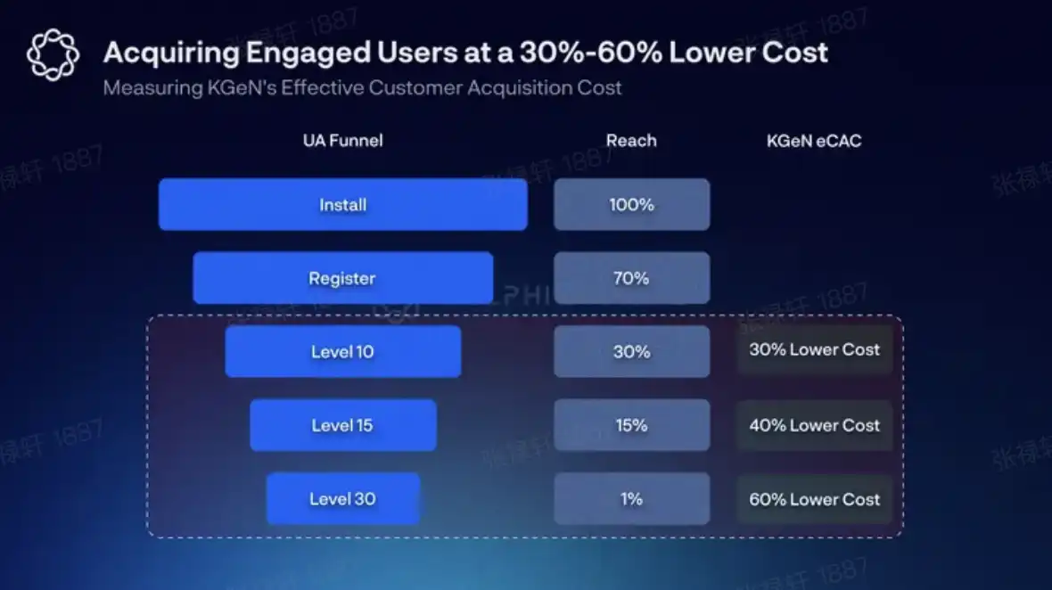 利用 PoG 引擎,KGeN 正在引领一种名为「有效客户获取成本」(eCAC)的替代 UA 框架。KGeN 不向简单的展示或漏斗顶部安装收费,而是仅向达到用户漏斗中部或底部的活跃用户收费。