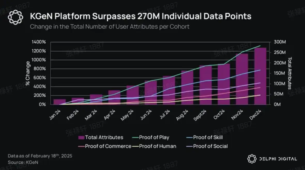 随着更多玩家加入 KGeN 以及 PoG 数据集的增长,更多的游戏工作室和发行商合作伙伴关系得以建立。这进一步推动了生态系统奖励,从而提高了参与玩家的价值。自 2024 年 1 月以来,这一增长飞轮已展现出显著效果,注册账户总数增长了 700% 以上,月活跃用户(MAU)增长了 1333%,数据属性总量增长了 992%。这使得 KGeN 成为市场上最活跃的 Web3 任务和玩家声誉网络。