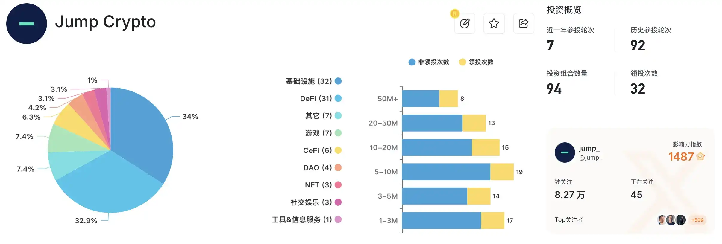 据相关的 RootData 页面显示,Jump Capital 的加密投资组合已超 80 个,主要投资于 DeFi、基础设施和 CeFi,投资过 loTeX、Sei、Galxe、Mantle、Phantom 等项目。