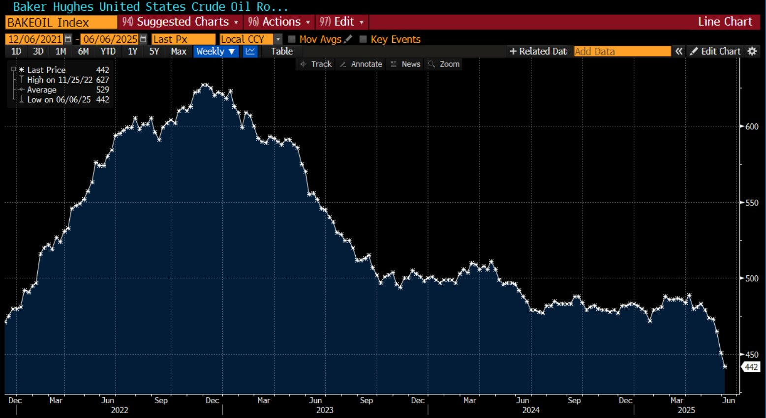 随着油价下跌,美国石油钻机越来越多地停止运营。贝克休斯美国原油钻机数量已降至2021年以来的最低水平。