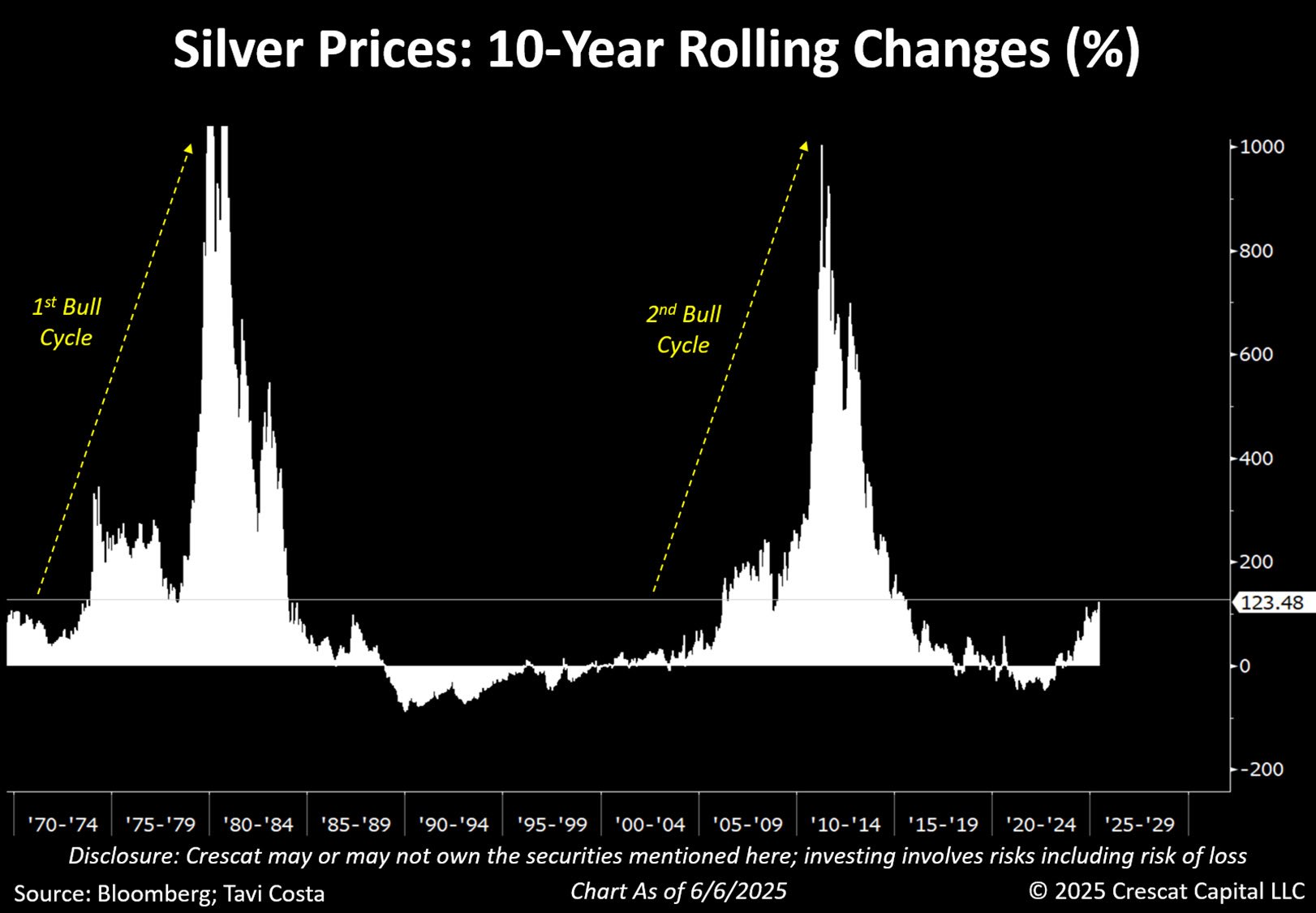 下图为白银价格十年滚动变化百分比,标记分别为白银的第一轮牛市周期和第二轮周期。上周白银表现令人瞩目,而在我看来,我们可能正处于该金属新一轮长期牛市的早期阶段。