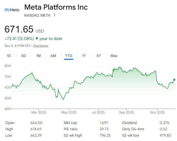 Meta(META)股票年初至今价格走势图。来源:谷歌财经