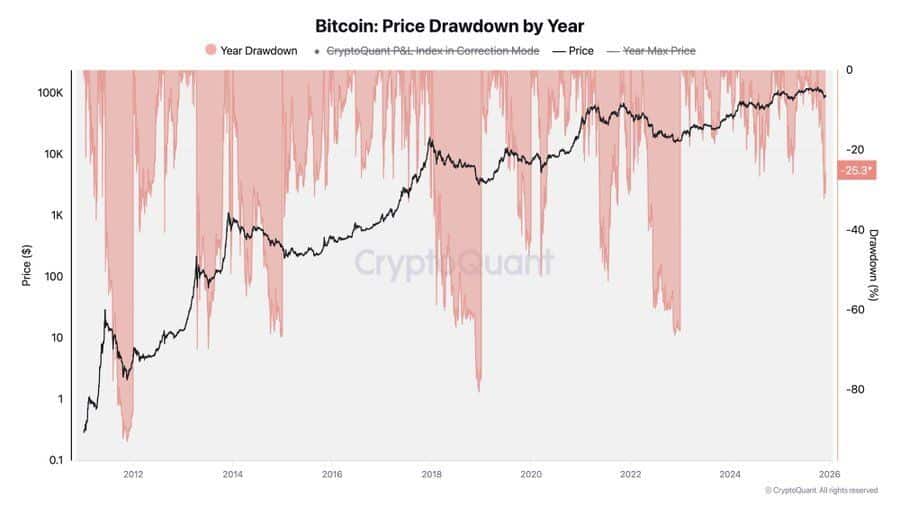 比特币的年度回撤幅度为25.3%。截至发稿时,远未达到过去周期中出现的 70% 至 80% 的深度调整幅度。
