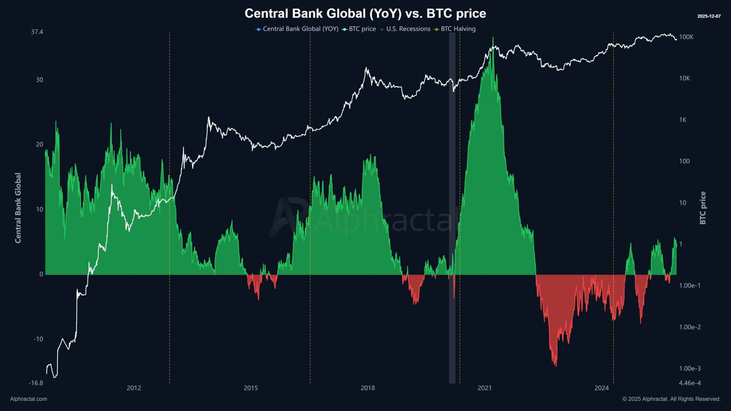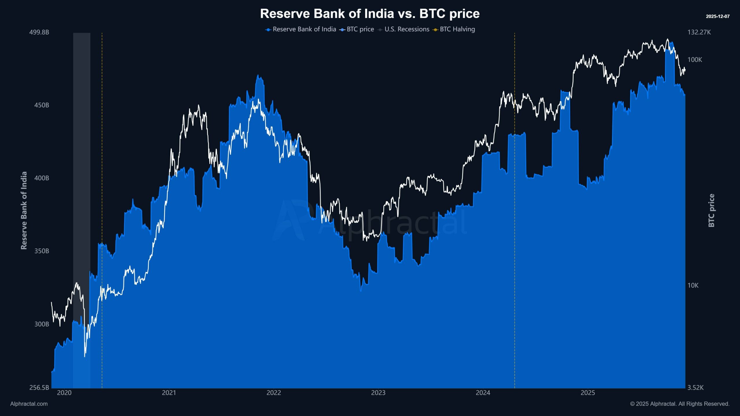 在主要央行中,印度储备银行与比特币价格的相关性最强。比特币价格的变化反映的是全球流动性的变化,而不仅仅是美联储的政策。