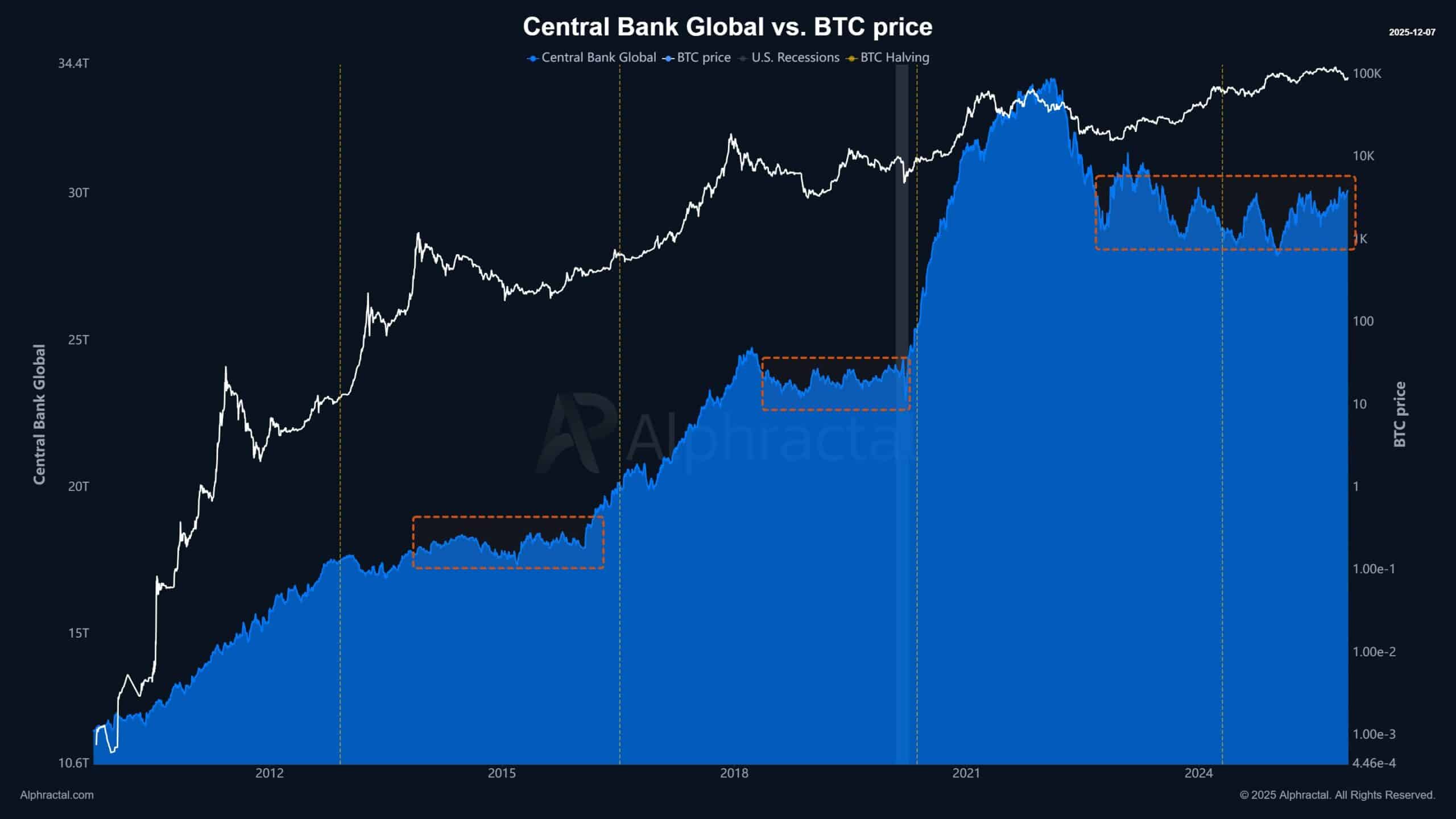 全球央行流动性几乎没动过自 2022 年以来,比特币价格一直徘徊在 28 万亿美元至 30 万亿美元之间。此前,正是这一区间导致比特币长期处于缓慢的横盘整理阶段,而非突破性上涨行情。
