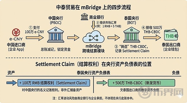第三步,泰国央行在 mBridge 的共享账本里铸造500 万数字泰铢。从资产负债表角度看,这是典型的央行发货币动作:泰国央行的负债端增加 500 万 THB-CBDC(欠泰国出口商),资产端则增加一笔 对中国央行的结算权利,记账单位是 100 万人民币,这就是所谓的 settlement claim。