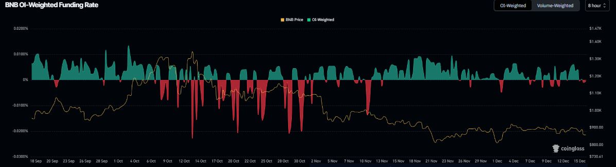 Coinglass 的 OI 加权融资率数据显示,押注 BNB 价格将进一步下跌的交易者数量超过了预期价格上涨的交易者数量。