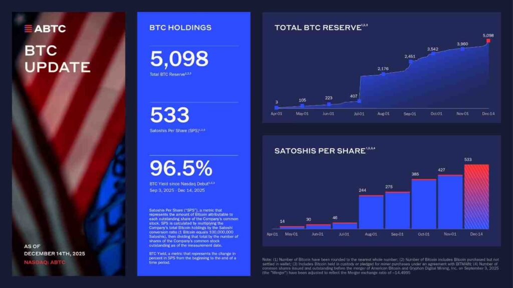 美国比特币公司(股票代码:ABTC)自 2025 年 9 月 3 日上市以来,一直在积累其比特币储备。自纳斯达克上市以来,这家比特币矿工通过保留挖矿产出和直接购买相结合的方式,稳步增加了其比特币持有量,使其跻身最大的上市企业比特币持有者之列。
